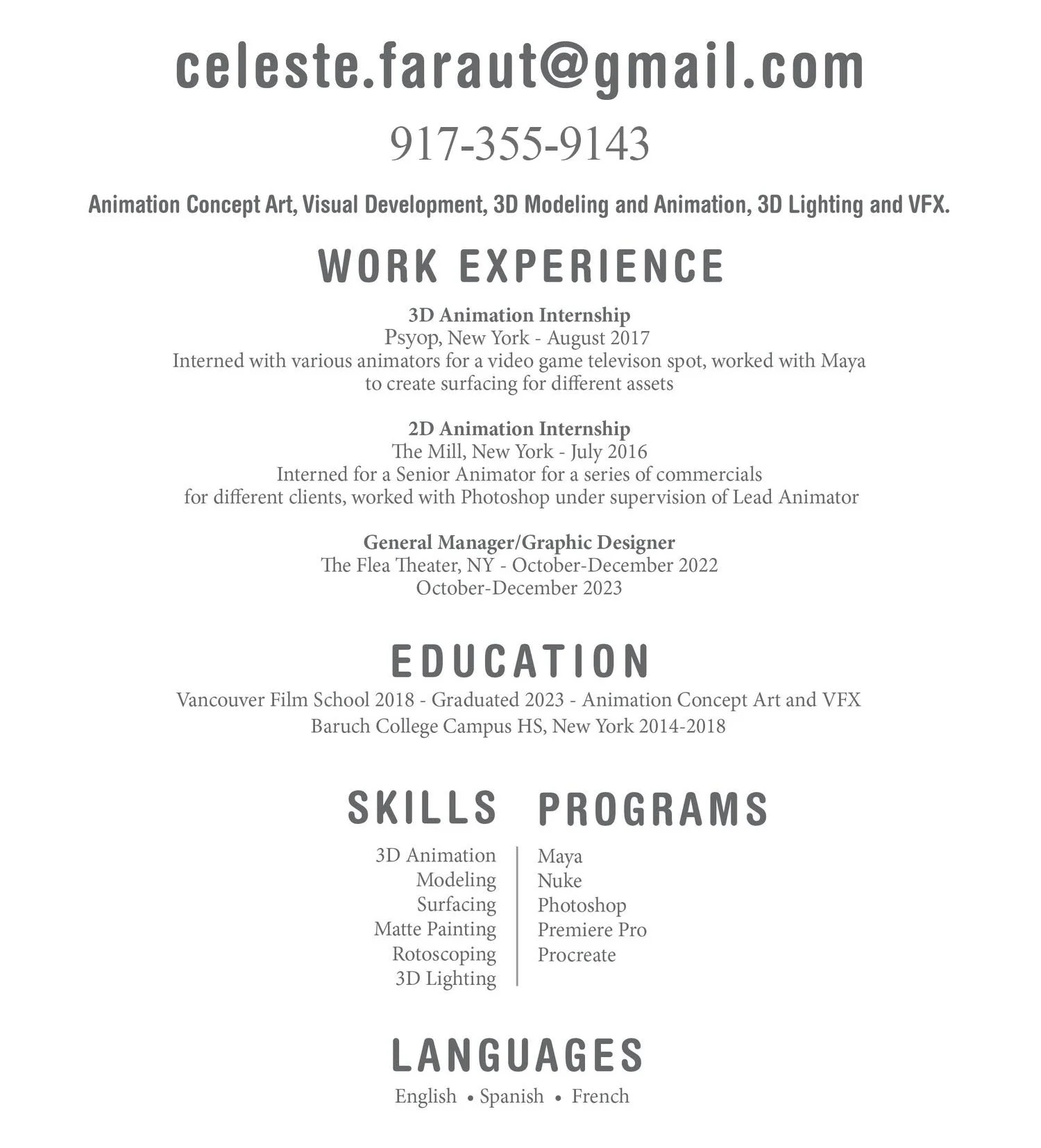 My name is Celeste Faraut and I am an aspiring concept artist and illustrator for games, animation, film, and more. I was born in New York City and graduated in February 2023 from Vancouver Film School having studied animation concept art, 3D animation and VFX.